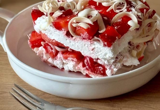Склопување: бисквитите кратко потопете ги во преливот и наредете ги во сад. Покријте ги со слој крем, посипете со коцки јагоди, изрендајте го чоколадото. Повторете уште еднаш, додека не ги потрошите состојките.