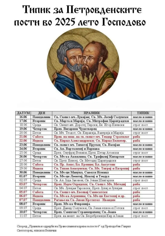 За православните христијански верници кои се водат според Јулијанскиот календар денеска почнува Петровденскиот пост во чест на светите апостоли Петар и Павле и му претходи на празникот Петровден, кој секогаш се одбележува на 12 јули.