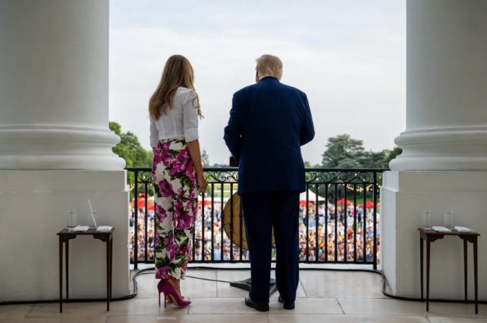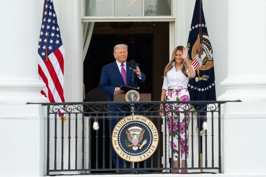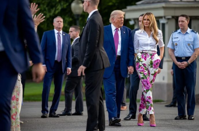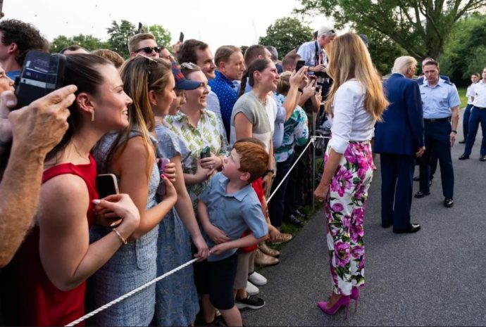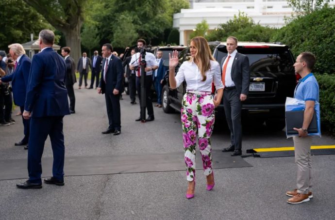 Сопругата на Доналд Трамп за оваа пригода избра ефективен летен стил, чија главна ѕвезда беа панталоните со цветен дезен. Моделот со висок струк, со прав крој е во бела боја и изгледа многу импресивно благодарение на огромните розови божури.
