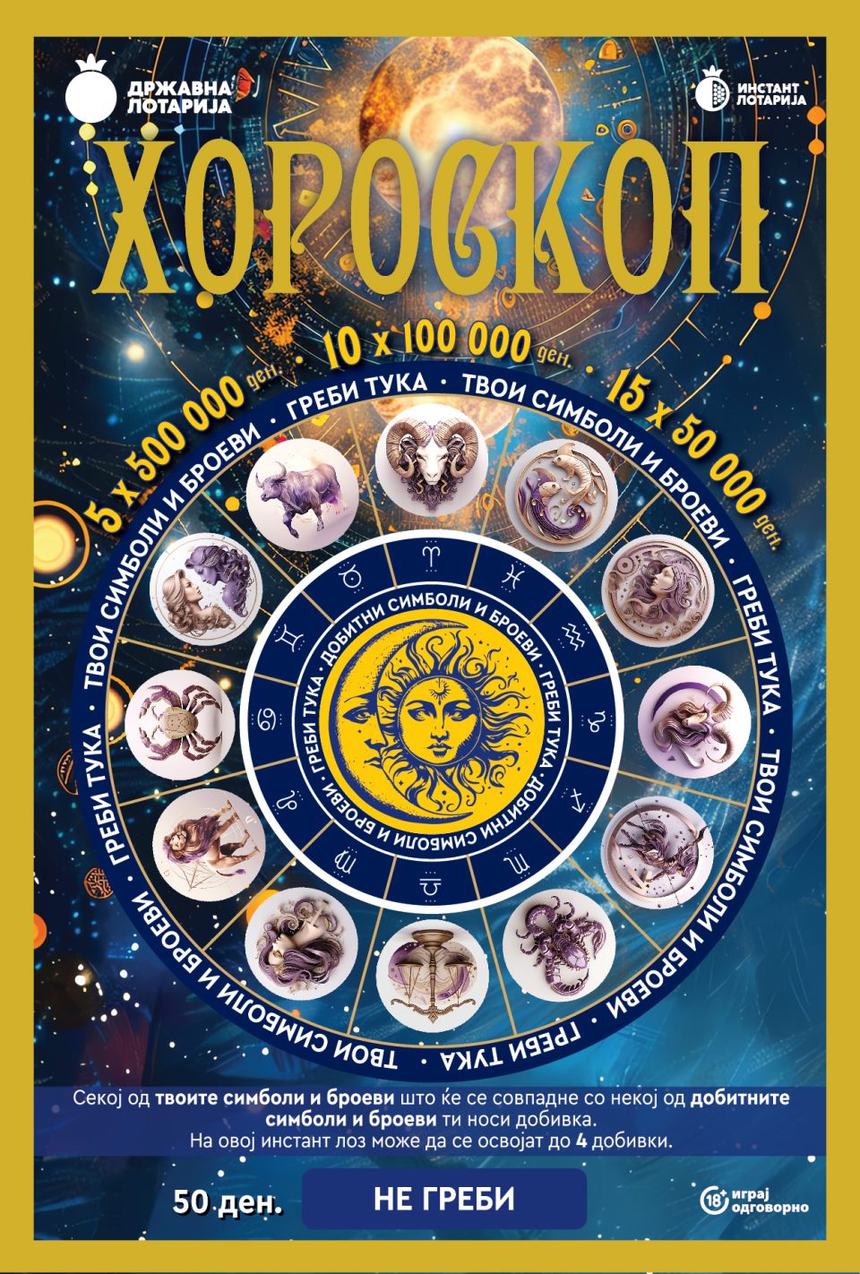 Инстант лоз со име „Хороскоп“ е најновиот член на семејството на инстант лотаријата на Државна лотарија. Со својот впечатлив дизајн и забавната игра се очекува да биде нова инспирација за забава со можности за добивки за љубителите на инстант лозовите.