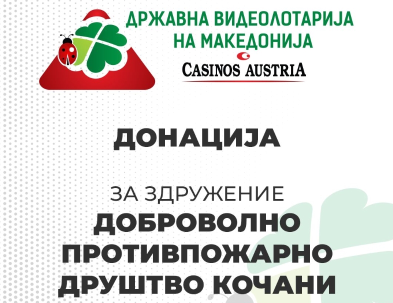 Видеолотарија Касинос Австрија обезбеди донација за Здружението ДОБРОВОЛНО ПРОТИВПОЖАРНО ДРУШТВО Кочани.