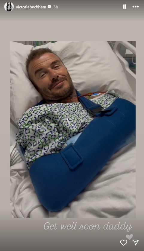 На фотографијата се гледа Бекам како лежи во болнички кревет со завој на раката. Викторија Бекам му упати емотивна порака на Инстаграм: „Брзо оздрави, тато.“