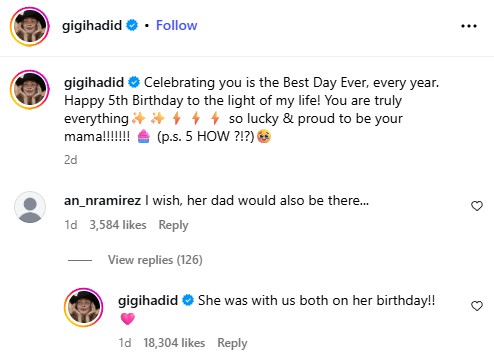 Како одговор на еден следбеник, Хадид напиша дека Малик бил со нив на роденденот на Каи.