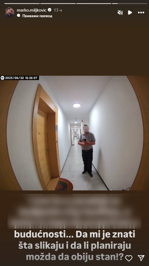Од објавените снимки се гледа дека непознатиот маж застанал на паркингот и направил неколку фотографии од нивната тераса, а потоа дошол пред влезната врата каде што продолжил да снима. Миљковиќ имаат камера во шпионката, па затоа биле сведоци на сè.