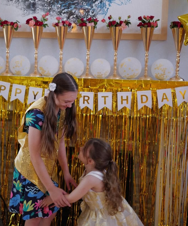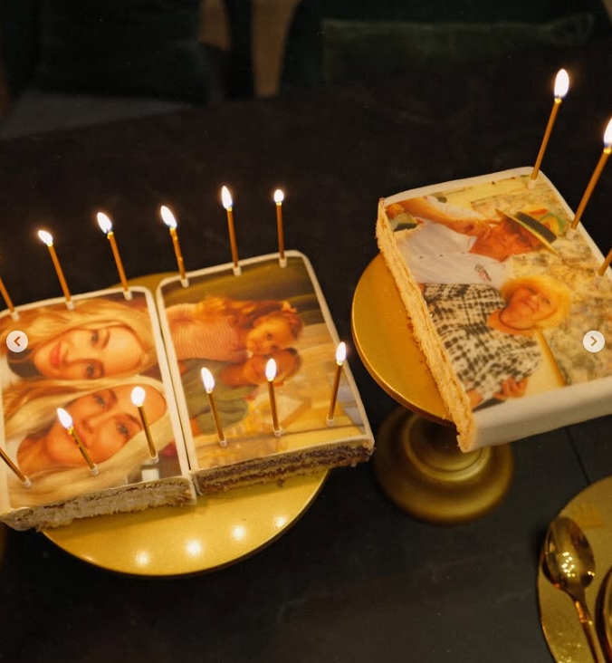 На масата доминираа елегантни роденденски торти со слики од членовите на нејзиното семејство, а просторијата беше украсена со цвеќиња и балони во златни тонови.