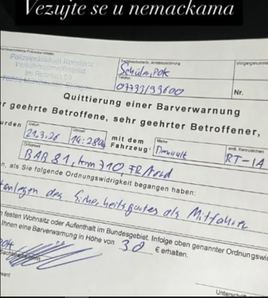 Според објавениот документ, прекршокот се случил денес, 21 март 2026 година, во 14:28 часот, на автопатот А81 во Германија, каде што Наташа е поради договорен настап.