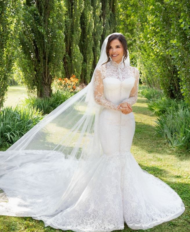 Невестата носеше италијанска чипкана тоалета во стилот на сирена, со висок врат и корсет од Долче и Габана.