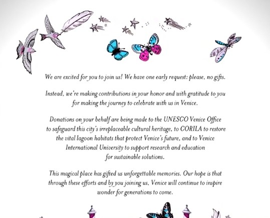 „Возбудени сме што ќе ни се придружите! Имаме едно барање: молиме, без подароци“, се вели во поканата. „Наместо тоа, даваме донација во ваша чест и со благодарност што патувате да прославите со нас во Венеција“, се вели во поканата.