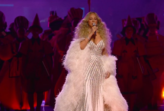Мараја блескаше во впечатлив бел фустан покриен со сребрени детали, а изгледот го дополни со наметка од пердуви и блескав накит, вклучувајќи прстен со пеперутка.