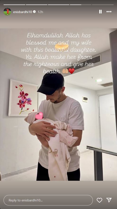 Капитенот на македонската фудбалска репрезентација, Енис Барди, стана татко. Неговата сопруга Фестина се породи и на свет донесе девојче, на кое родителите ѝ го дадоа името Аја.