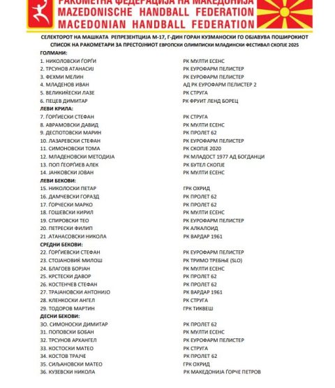 Селекторот на машката репрезентација, Горан Кузмановски го објави поширокиот список на ракометари за претстојниот европски олимписки младински фестивал Скопје 2025.