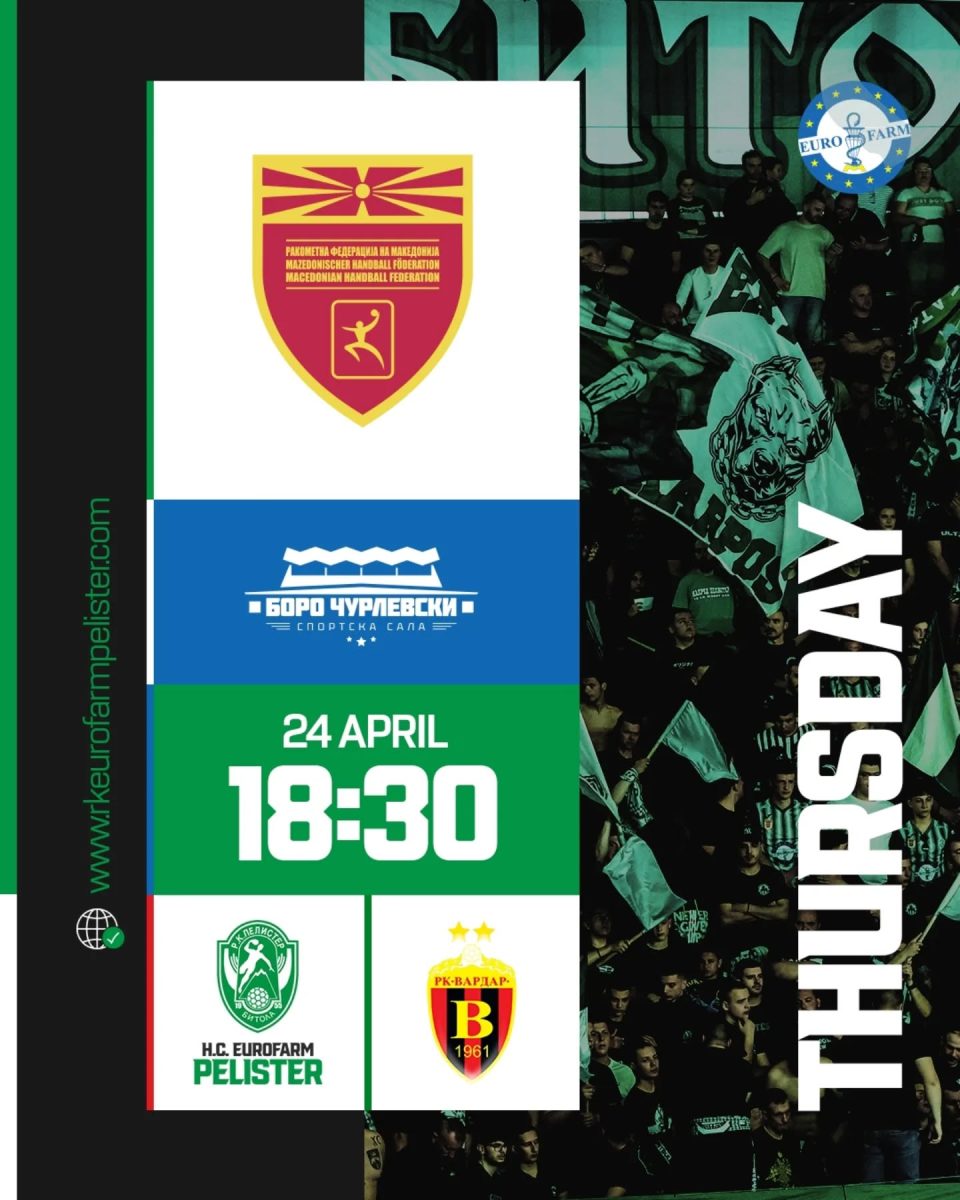 Првото вечно ракометно дерби во македонскиот машки ракометен плеј-оф помеѓу Е.Пелистер и Вардар ќе биде одиграно во четврток во салата „Боро Чурлевски“ со почеток од 18 часот и 30 минути.