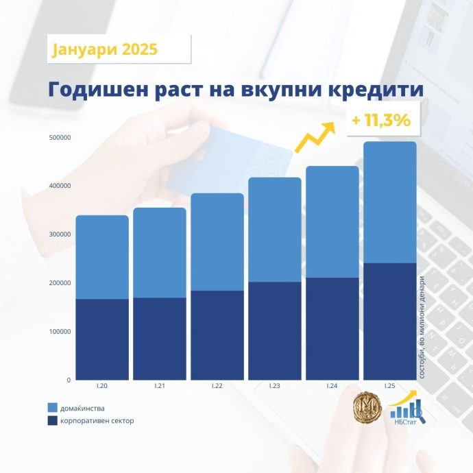 Вкупните депозити во јануари на годишно ниво бележат зголемување од 11,0%, во поголем дел поради растот на депозитите на домаќинствата, но и на корпоративниот сектор. Вкупните кредити, пак, бележат раст од 11,3% како резултат на растот на кредитирањето кај двата сектора, со поизразен придонес на корпоративниот сектор, соопшти Народната банка.