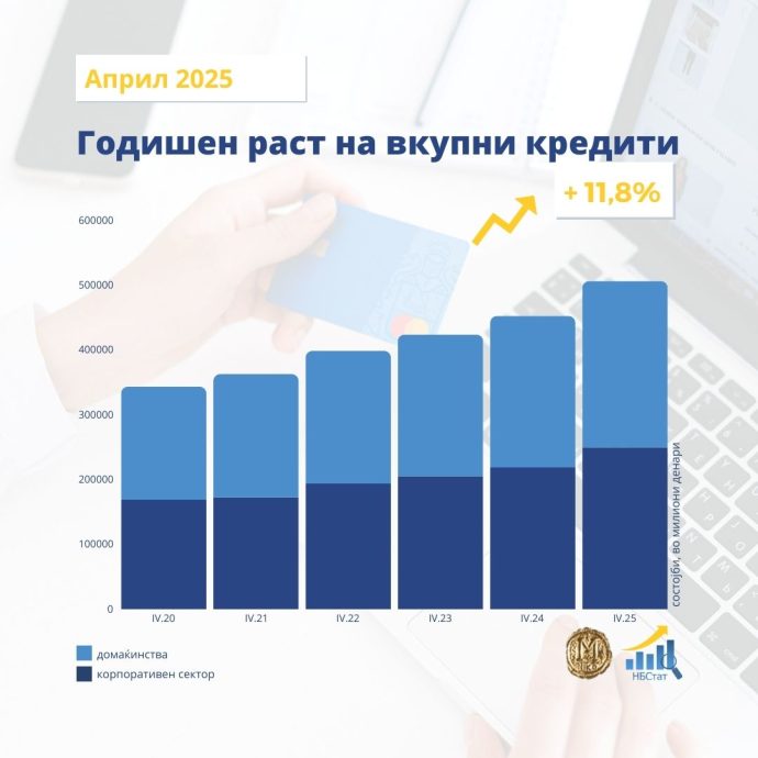 НБ соопшти дека во април 2025 година, вкупните кредити, бележат раст од 0,8% и 11,8%, на месечна и на годишна основа, соодветно. Промената кај двете основи е резултат на зголеменото кредитирање на двата сектора, при поизразен придонес кон растот на кредитите на корпоративниот сектор.