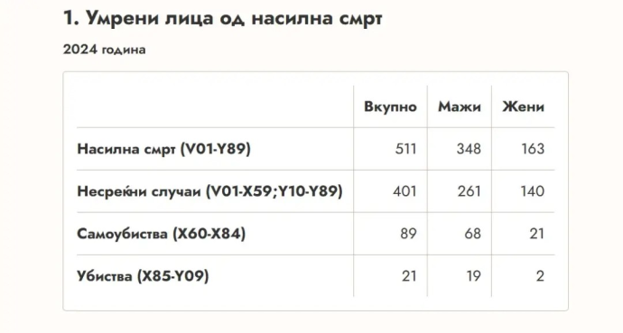 Бројот на умрени лица од насилна смрт минатата година е зголемен за 24 проценти во однос на 2023-та. Од вкупно 511 умрени лица, над 68 проценти се мажи, а најчеста причина, во 78,5 проценти од случаите се несреќни случаи, покажуваат податоците на Државниот завод за статистика.