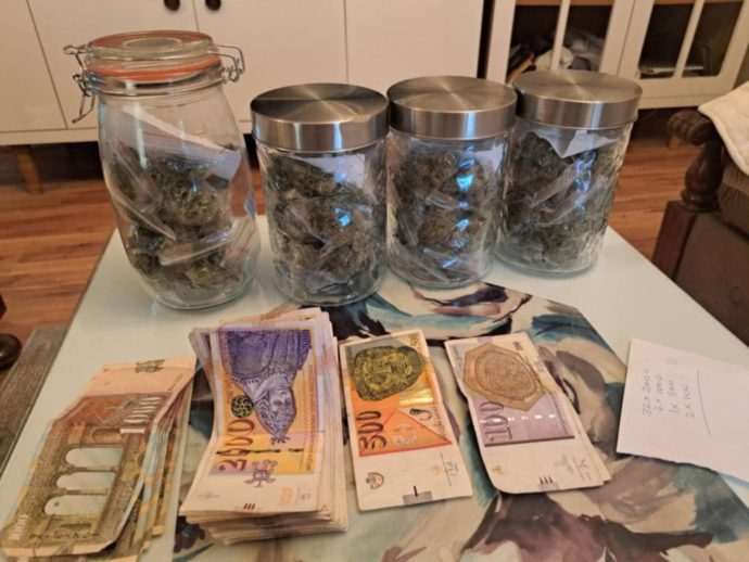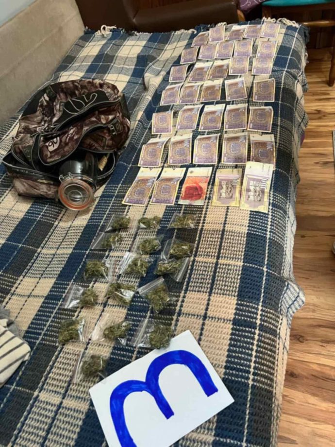 При претрес во неговиот дом ипомошни простории, извршен со судска наредба, биле пронајдени и одземени четири тегли со марихуана, пари во различни апоени и други предмети за кои постои сомнение дека потекнуваат од кривично дело.