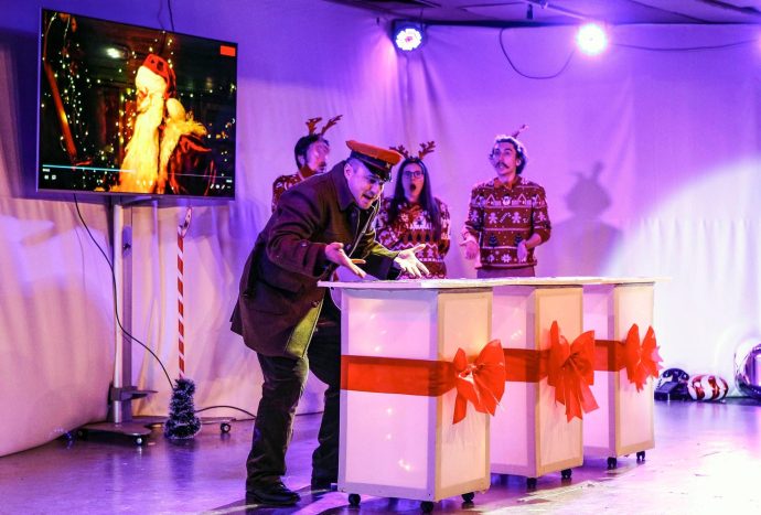 Претставата ги следи патешествијата со кои се соочува Дедо Мраз пред да стигне на Железничката станица во Скопје и неговото доаѓање е неизвесно, па му треба помош од неговите Елени, Џуџиња, Снешко, но најмногу од неговите обожаватели, децата.