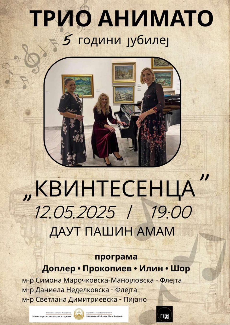 По пет успешни години на музичко творештво и настапи на домашната и меѓународната сцена, Камерното трио „Анимато“ ќе го прослави својот јубилеј со свечен концерт насловен „Квинтесенца“. Настанот ќе се одржи на 12 мај 2025 година, со почеток во 19:00 часот, во Даут Пашиниот амам во Скопје, во организација на Националната галерија.