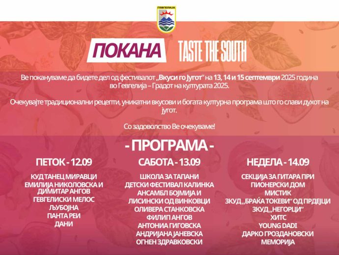 Од 12 до 14 септември Гевгелија ќе биде домаќин на третото издание на фестивалот „Вкуси го југот“ (Taste the south). Традиционална културно-забавна манифестација за промоција на Гевгелија, која не е само обичен тридневен музички хепенинг, туку преставува своевидна фузија на традицијата, културата и забавата и тоа во повеќе сегменти.