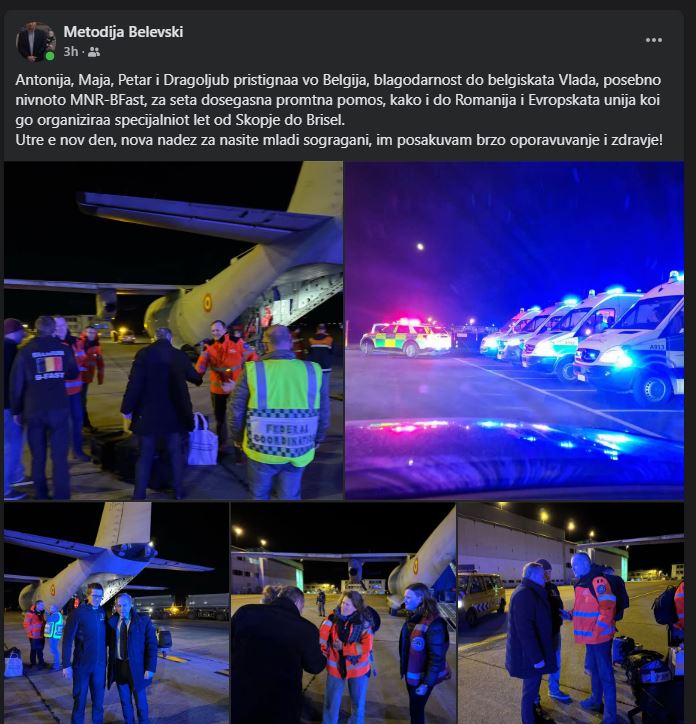 Четири пациенти од повредените во доскотеката во Кочани пристигнаа во Белгија, благодарност до белгиската влада, посебно до B-Fast за сета досегашна помош, напиша македонскиот амбасадор во Белгија, Методија Белевски.