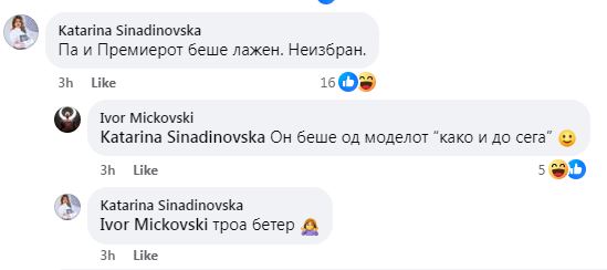 Новинарката Катерина Синадиновска се надоврза со саркастичен коментар: „Па и Премиерот (Ковачевски) беше лажен. Неизбран.“