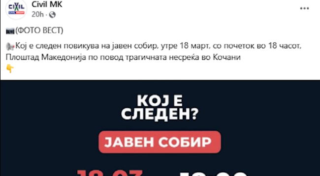 Обид за политизација на големата трагедија во Кочани. Додека семејствата тагуваат за смртта на 59-те свои најмили, а во државата има седумдневна жалост, одредени невладини организиции, кои важат за блиски до опозицијата, која до пред само неколку месеци беше власт, повикуваат на протести. Една од тие невладини е Цивил МК на Џабир Дерала, кој важи за еден од најблиските до опозициската СДСМ.