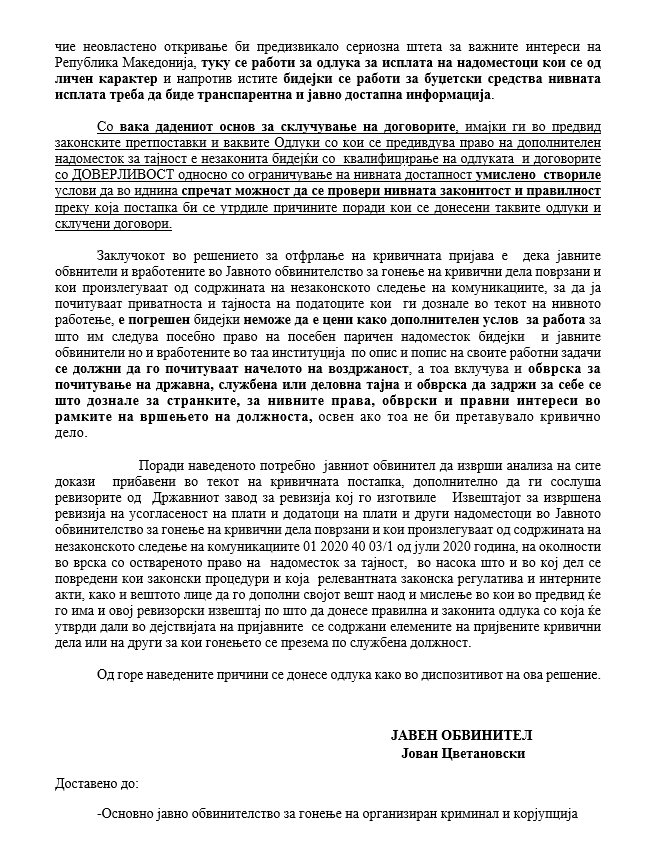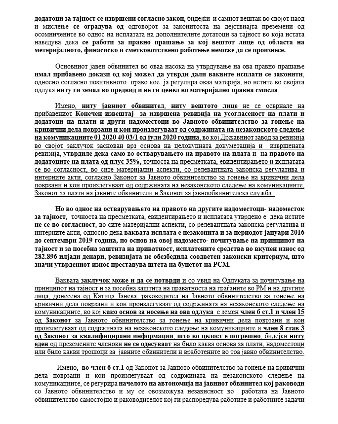 Забелешка: останатата сума пари до 282.896.060,оо денари(околу 4.599.935 евра) противправно е исплатена на 93 јавнообвинителски службеници и помошно-технички персонал, за 27 се истражители, за 19 се волонтери, 9 се лица ангажирани со договор за дело, лица ангажирани за консултански услуги.