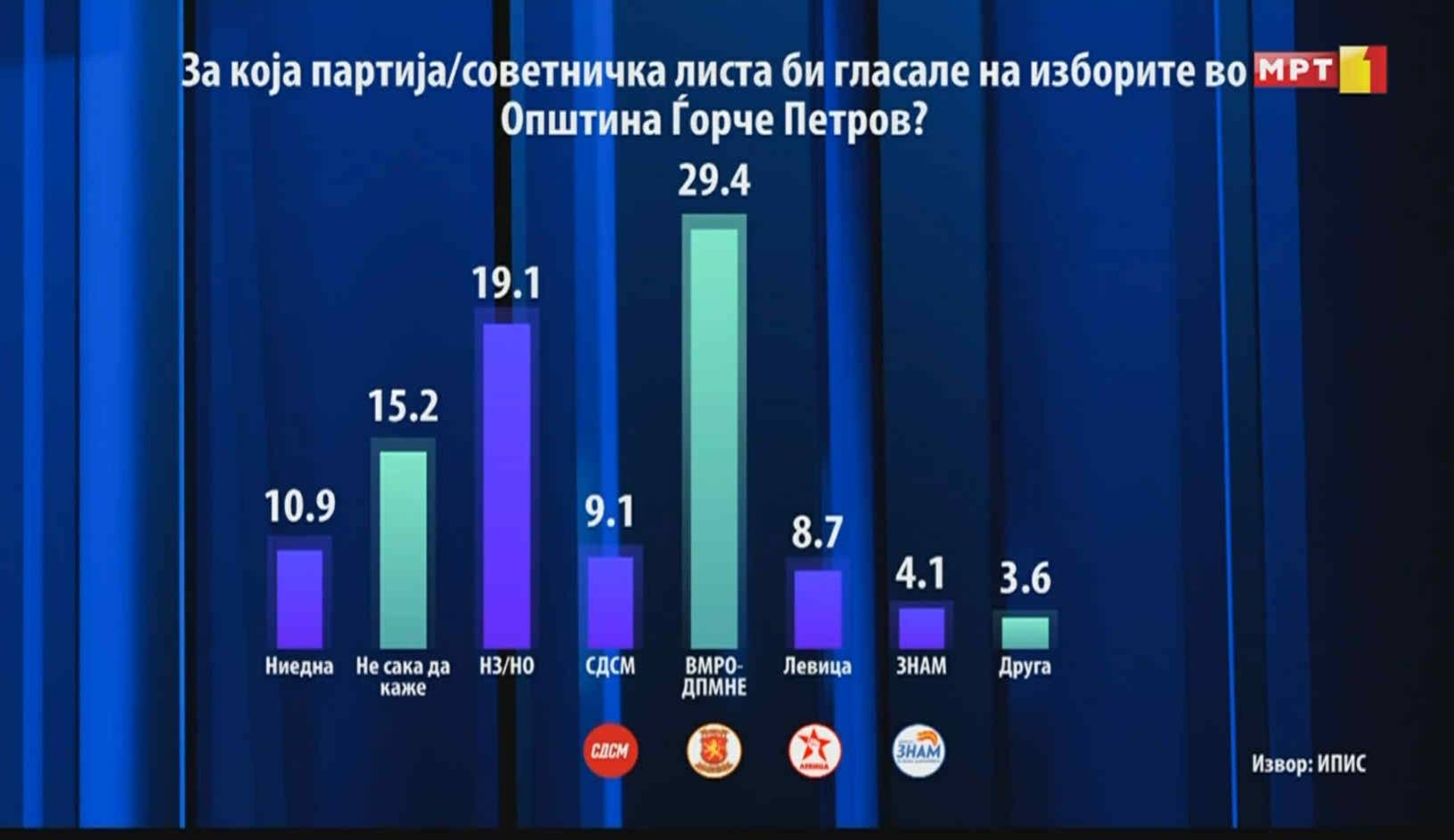 На прашањето за која партија / советничка листа би гласале на локалните избори во Општина Ѓорче Петров, владејачката ВМРО-ДПМНЕ е со високи 29.4 проценти пред опозициската СДСМ и Левица со 9.1 и 7.7 проценти, партијата ЗНАМ е со рејтинг од 4.1 процент…