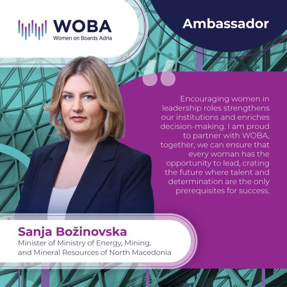 Министерката за енергетика, рударство и минерални суровини, Сања Божиновска, активно се вклучи во регионалната иницијатива Women on Boards Adria (WOBA), насочена кон јакнење на женското лидерство на највисоките управувачки нивоа – во управни одбори, извршни совети и клучни институции.