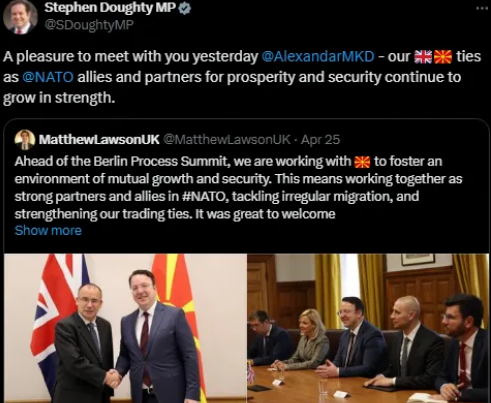 Стивен Даути, Министер задолжен за Европа и Северна Америка на Обединетото Кралство, сподели детали на Платформата Х за средбата со вицепремиерот Александар Николоски.