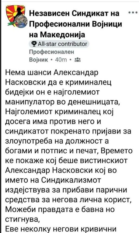 -Нема шанси Александар Насковски да е криминалец бидејќи тој е најголемиот манипулатор во денешницата. Најголемиот криминалец против кого досега има синдикатот покренато пријави за злоупотреба на службена должност, потпис и печат. Времето ќе покаже кој беше вистинскиот Александар Насковски кој во име на Синдикализмот издејствува да прибави парични  средства за негова лична корист. Можеби правдата е бавна, но стигнува, порачуваат од Синдикатот.