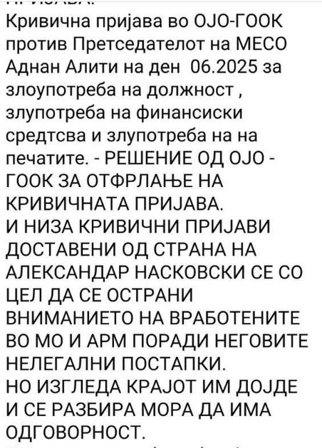 Тие денес на социјалните мрежи објавија дел од кривичните пријави кои се поднесени за ова лице. Според документите, против Насковски се поднесени кривични пријави за злоупотреба на должност, злоупотреба на финансиски средства и злоупотреби на печатите.