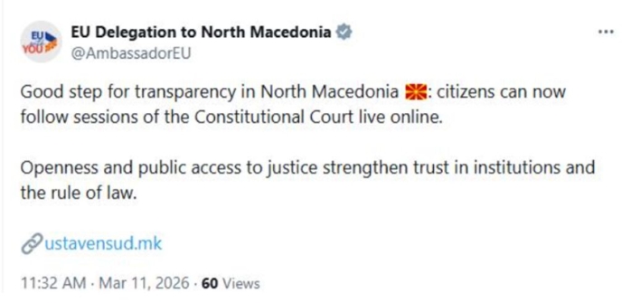 -Добар чекор за транспарентноста во Република Македонија, граѓаните сега можат да ги следат седниците на Уставниот суд онлајн, во живо. Отвореноста и јавниот пристап до правдата ја зајакнуваат довербата во институциите и во владеењето на правото, пишува во постот на ЕУ Делегацијата.