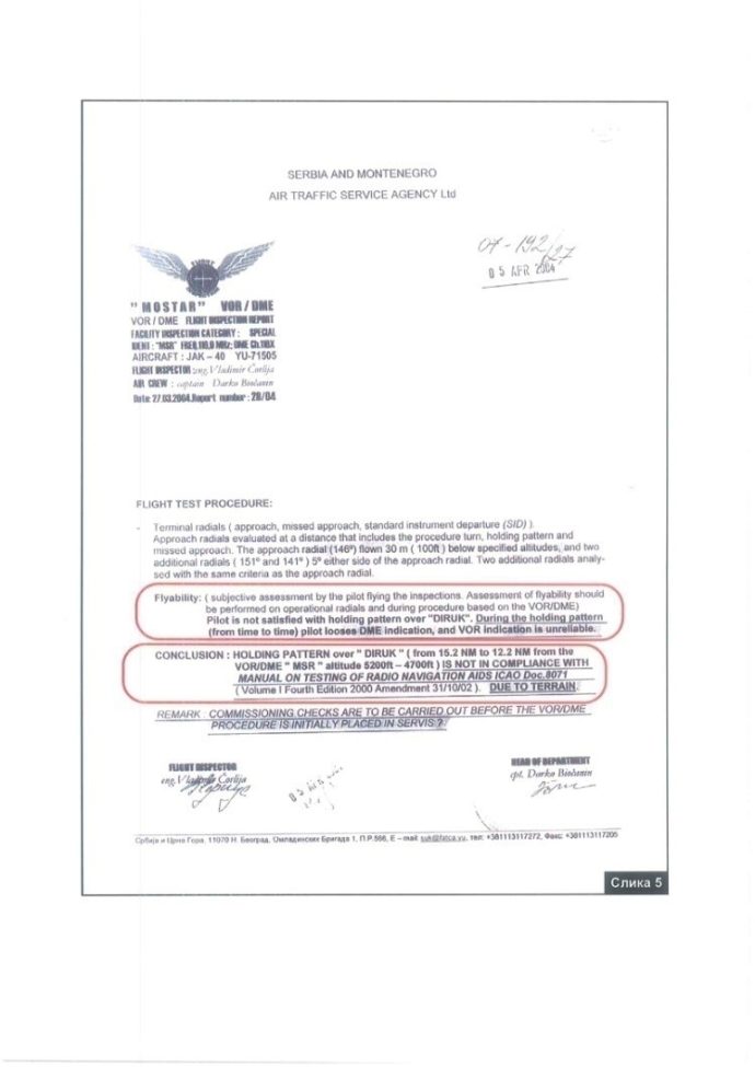 Слика 3: Flight Inspection Report DVOR/DME Mostar, Bosnia and Hercegovina, 16.04.2004 година, направено од Aerodata Flight Inspection Brounschweig, Deutschland.