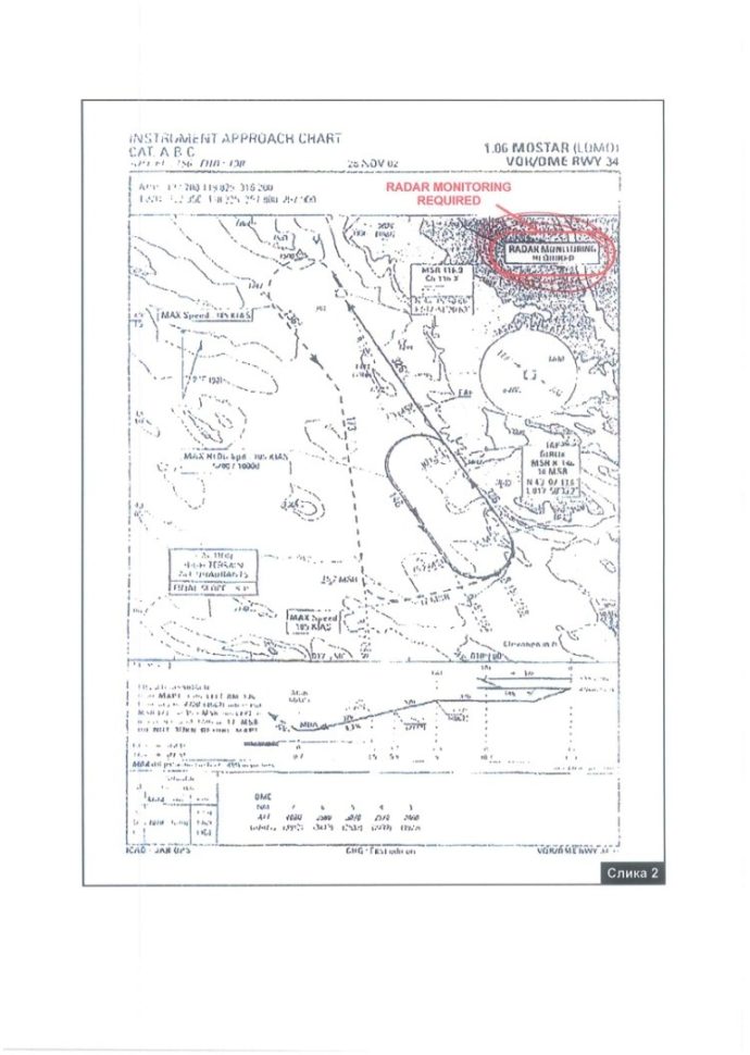 3. Процедурата за непрецизен приод за слетување на аеродромот во Мостар, 1.06 Mostar LQMO VOR/DME RWY 34(Jeppesen 13-1), објавена на 01.02.2003 од страна на Дирекцијата за цивилна авијација на БиХ и повторно објавена на 20.02.2003 од страна на DIRCAM (Direction de la Circulation Aerienne Militaire – Дирекција за воена контрола на летање на Франција), не е во согласност со ICAO DOC 8168, Volume II, Part III, Chapter 6, paragraph 6.4, што значи дека не ги исполнува условите за непрецизен приод (straight-in non-precision approach). – ПОГРЕШНА ПРОЦЕДУРА, СО МИНИМУМИ ЗА ЛЕТАЊЕ НА ВОЕНИ ЛЕТАЛА, А НЕ НА ЦИВИЛНИ ЛЕТАЛА, КАКО ШТО ПРЕДВИДУВААТ ИЦАО СТАНДАРДИТЕ