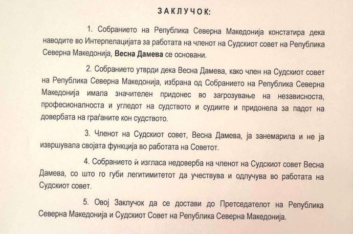 ФОТО: Предлог заклучокот, доколку мнозинството пратеници ја поддржи интерпелацијата и ѝ изгласа недоверба на Весна Дамева