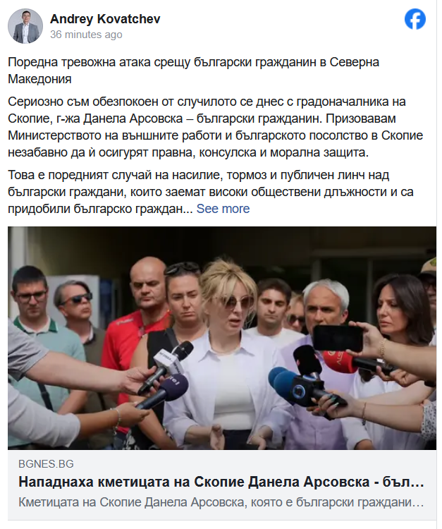 „Ова е уште еден случај на насилство, вознемирување и јавен линч врз бугарски државјани кои имаат високи јавни функции и бугарско државјанство врз основа на докажано бугарско потекло – само затоа што се изјасниле како Бугари,“ наведува Ковачев во својата објава.