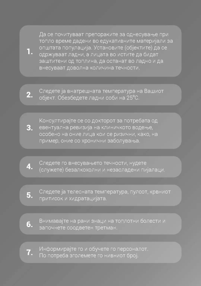 Од ИЈЗ додаваат и да се информираат семејството, пријателите и соседите за препораките и мерките за заштита од топлото време.