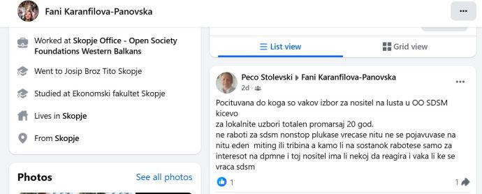 -Почитувана до кога со ваков избор за носител на листа во ОО СДСМ Кичево, за локалните избори тотелен промашај 20 години. Не работи за СДСМ, нонстоп плукаше, вреѓаше, не се појавуваше на ниту еден митинг или трибина, а камо ли состанок, работеше само за интересот на ДПМНЕ и тој е носител. Има ли некој да реагира и вака ли ќе се враќа СДСМ, и пишува на ѕидот на Фејсбук профилот на потпретседателката на СДСМ Фани Каранфилова Пановска, разочараниот нивни член од ОО Кичево.