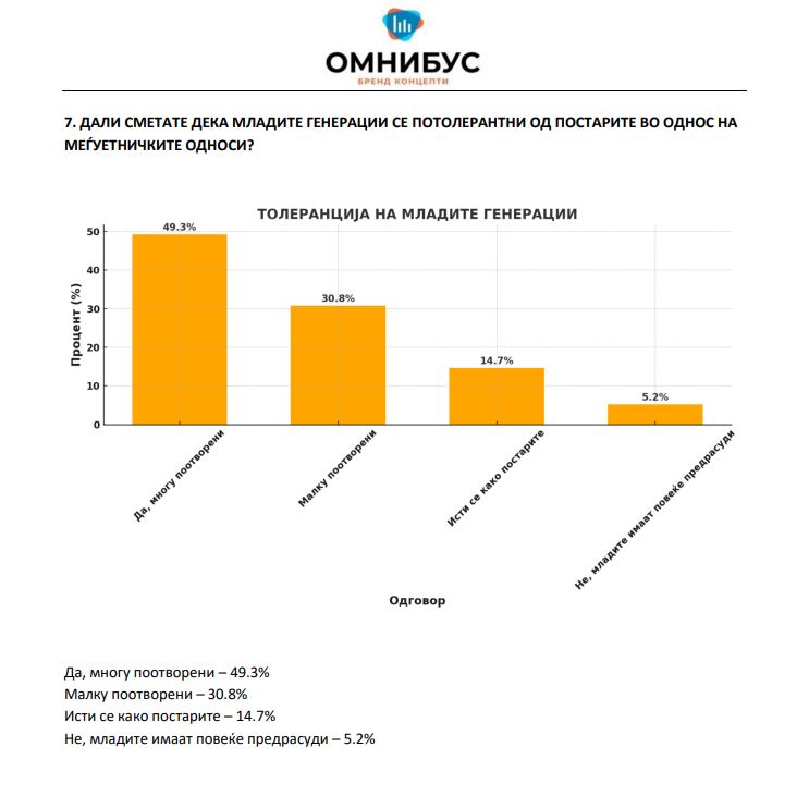 Едно од прашањата во оваа анкета беше „Дали сметате дека младите генерации се потолерантни од постарите во однос на меѓуетничките односи?“, а скоро половина од испитаниците 49.3 % одговориле ДА МНОГУ ПООТВОРЕНИ, 30,8 % МАЛКУ ПООТВОРЕНИ, 14,7 % ИСТИ СЕ КАКО ПОСТАРИТЕ и 5,% од испитаниците одговориле НЕ, МЛАДИТЕ ИМАА ПОВЕЌЕ ПРЕДРАСУДИ.