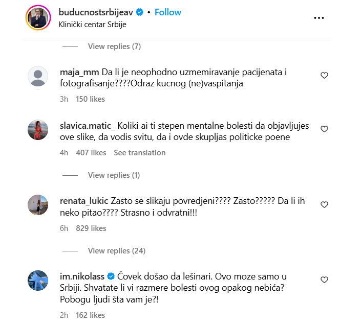 Ги пративме да ги лечат, а не со нив да се прави ПР, велат дел од Македонците кои исто така реагираат на фотографиите од Вучиќ во болницата.