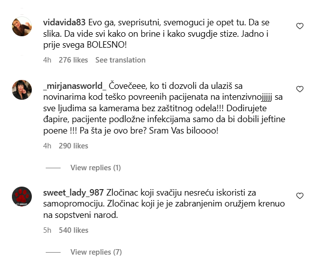 „Срам да ти е Вучиќ! Немаш тронка достоинство! Од каде имаш право да сликаш луѓе, болни во завои, заради самопромоција! Срам за тебе и за целата твоја придружба!“