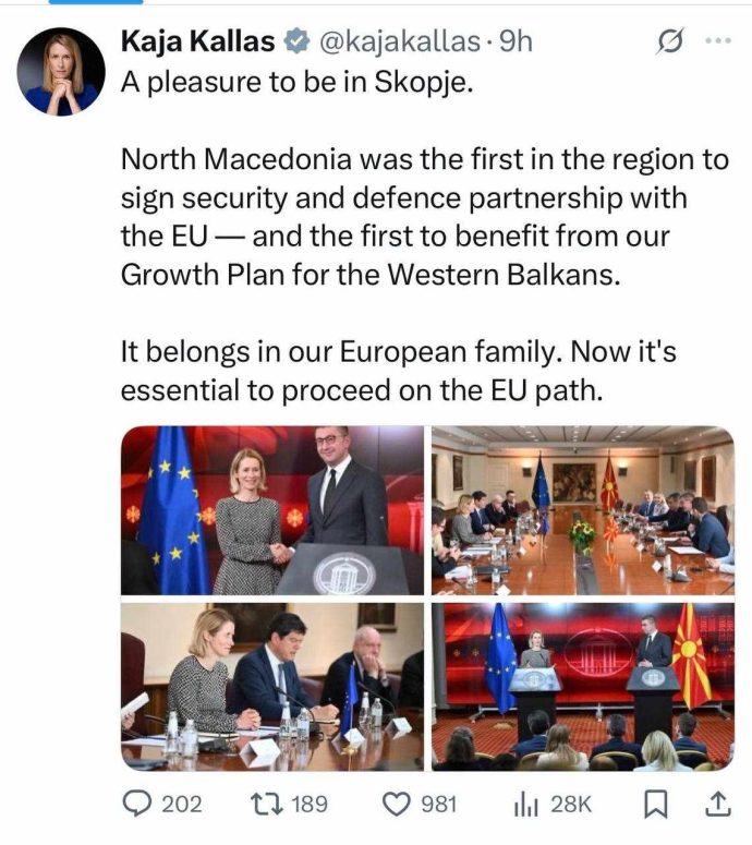 По посетата на социјалните мрежи, Калас напиша дека е задоволство да се биде во Скопје, како и дека Македонија припаѓа на европското семејство.