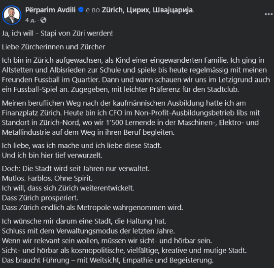 – Израснав во Цирих како дете на семејство со мигрантско потекло. Моето образование го стекнав во населбите Алтштетен и Албисриден, а и денес останав близок со моето маало – сè уште играм фудбал со другарите од детството. Цврсто сум поврзан со овој град и секојдневно го живеам со страст она што го правам,“ напиша Авдили.