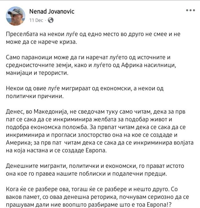 Идеологот на СДСМ и еден од најгласните јавни поддржувачи на Зоран Заев и Венко Филипче, Ненад Јовановиќ, отворено промовира прифаќање мигранти во Македонија преку свои објави на социјалните мрежи.
