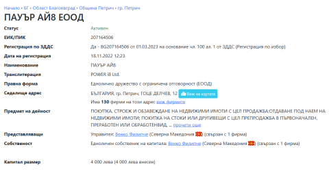 Венко Филипче оваа фирма во Бугарија ја основал на 18.11.2022 година, со седиште во Петрич на улица Гоце Делчев бр.12, адреса која ја дели со многу фирми на Заеви.