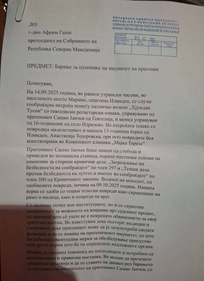 -Со целосна почит кон институциите, но и со сериозна загриженост за можноста од влијание врз судскиот процес, од причина што уште не е покренато обвинение за овој трагичен настан, Ве известувам дека постојат индиции и сомневања дека пратеникот може да ја злоупотреби својата функција и да се повика на пратеничкиот имунитет, со што би избегнал евентуални мерки за обезбедување присуство или други мерки што би ги определиле надлежните органи, се наведува во барањето за одземање на имунитет.