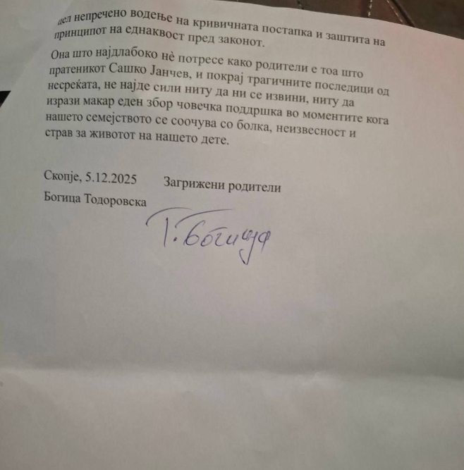 Загрижените родители на повреденото девојче потенцираат дека по трагичната несреќа, пратеникот не им упатил ни извинување додека тие се соочувале со болка, неизвесност и страв за животот на своето дете.