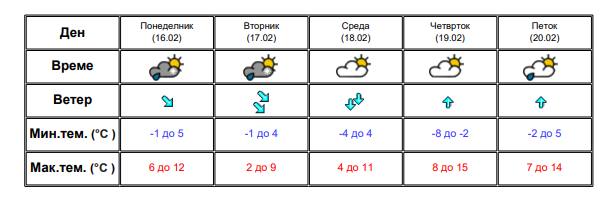 Минималните утрински температури ќе се движат од -8 до 5 степени, додека дневните максимални ќе бидат во интервал од 2 до 15 степени Целзиусови,