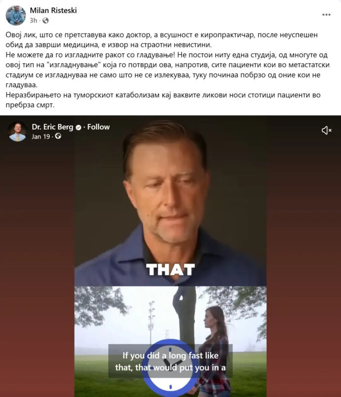 – Овој лик што се претставува како доктор, а всушност е киропрактичар, после неуспешен обид да заврши медицина, е извор на страотни невистини. Не можете да го изгладните ракот со гладување! Не постои ниту една студија, од многуте од овој тип на „изгладнување“ која го потврди ова, напротив, сите пациенти кои во метастатски стадиум се изгладнуваа не само што не се излекуваа, туку починаа побрзо од оние кои не гладуваа. Неразбирањето на туморскиот катаболизам кај ваквите ликови носи стотици пациенти во пребрза смрт – стои во објавата на Фејсбук на доктор Ристески.